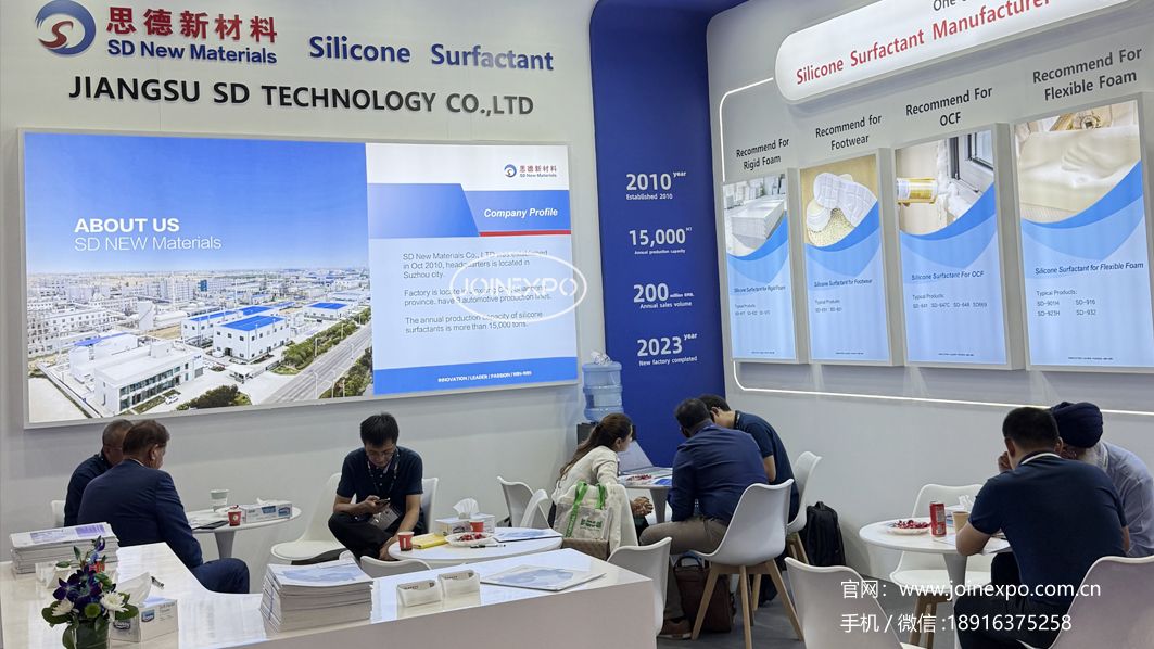 制品展区涵盖聚氨酯泡沫(软/硬)、聚氨酯弹性体、聚氨酯鞋底原液、组合料、聚氨酯革用树脂、聚氨酯弹性纤维(氨纶)、聚氨酯粘合剂、密封胶等多种产品。